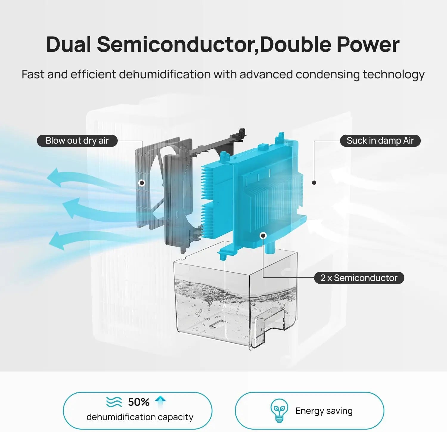 Cobectal Dehumidifier uses advanced semiconductor technology to efficiently remove up to 16oz (1500ml) of water in 24 hours at 86°F and 80% RH. Perfect for bathrooms, bedrooms, living rooms, offices, and more.SAFE AND SMART, AUTO SHUT OFF PROTECTION: