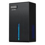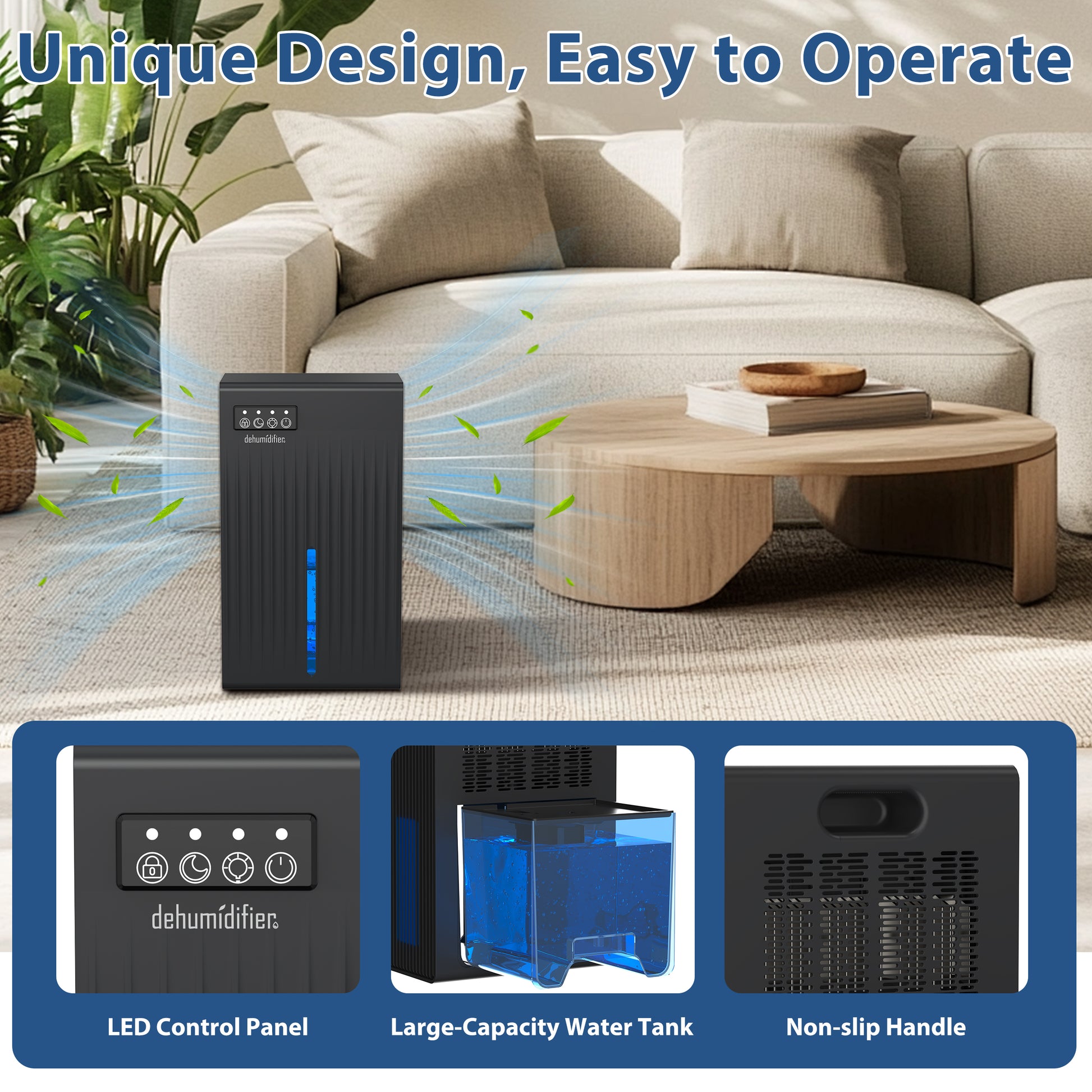 Equipped with an upgraded water tank, the dehumidifier shuts off automatically when full, with a red light alert. The secure lid prevents spillage, and the tank is designed for easy removal and cleaning.