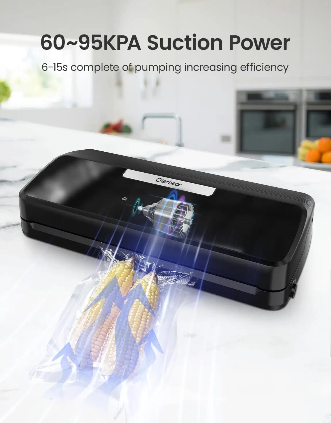 EFFICIENCY AND SECURITY: 60~95Kpa suction and 110W power. This Vacuum Sealer machine only takes 6-15 s to complete a vacuum sealing. And this Vacuum Sealer is equipped with an overheating secure device. When the temperature reaches the preset temperature, the Vacuum Sealer will enter the security mode. Then the indicator light is on. You can't use it until the temperature returns to a secure level and the light goes out.minutes. When the temperature returns to the secure range, the indicator light is off. The Vacuum Sealer can continue to use.